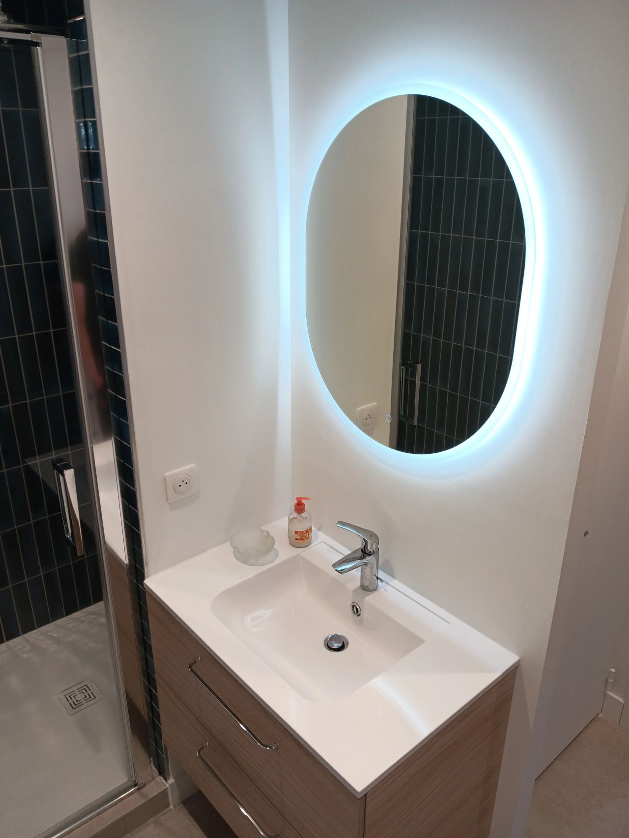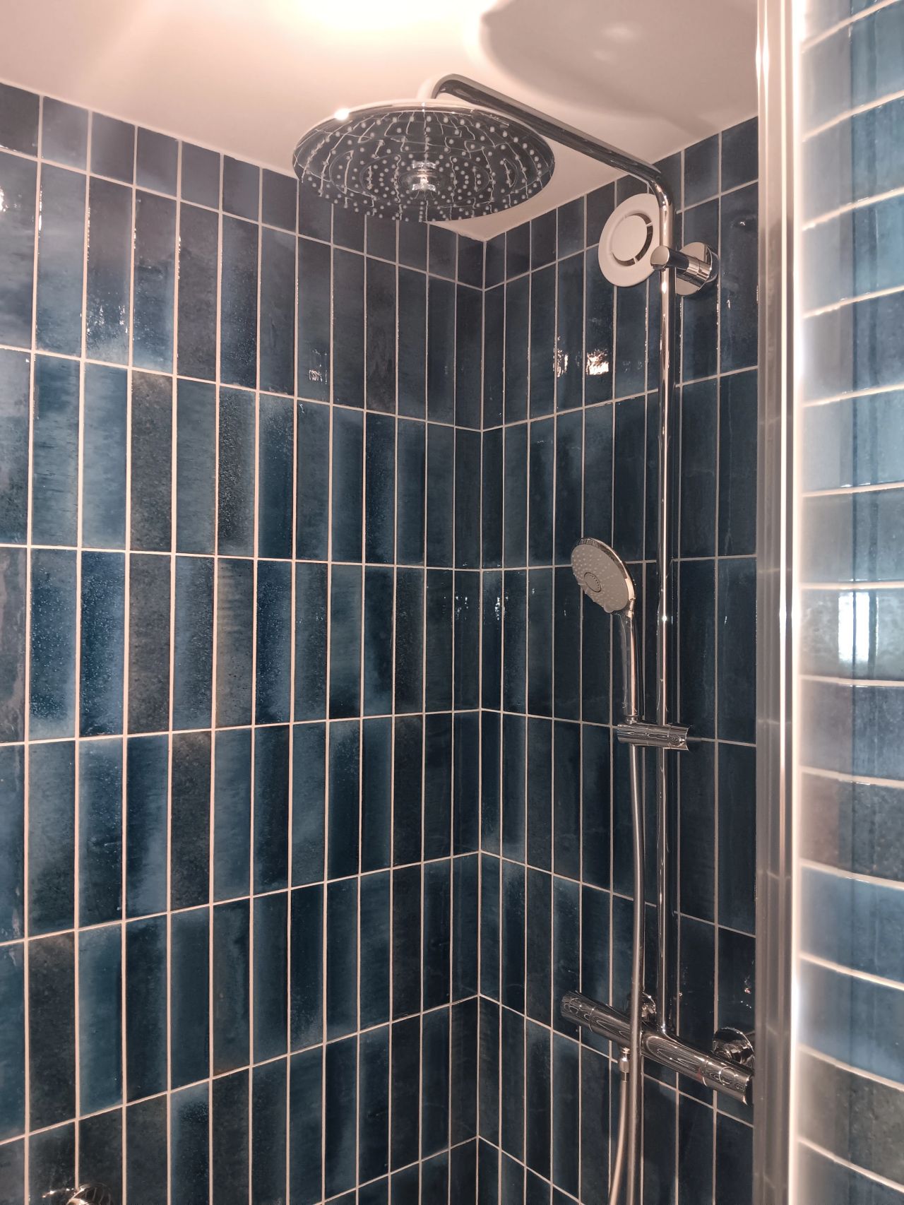 Transformation réussie ! Douche à l’italienne avec paroi vitrée, carrelage bleu vertical tendance, colonne de douche avec pommeau pluie, meuble vasque en bois et miroir LED rétroéclairé. Un esthétisme épuré et moderne.